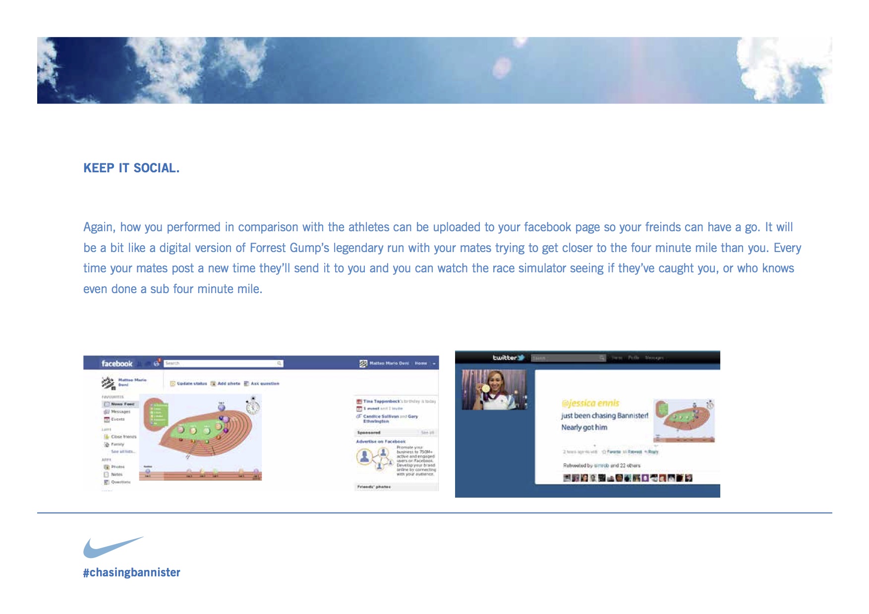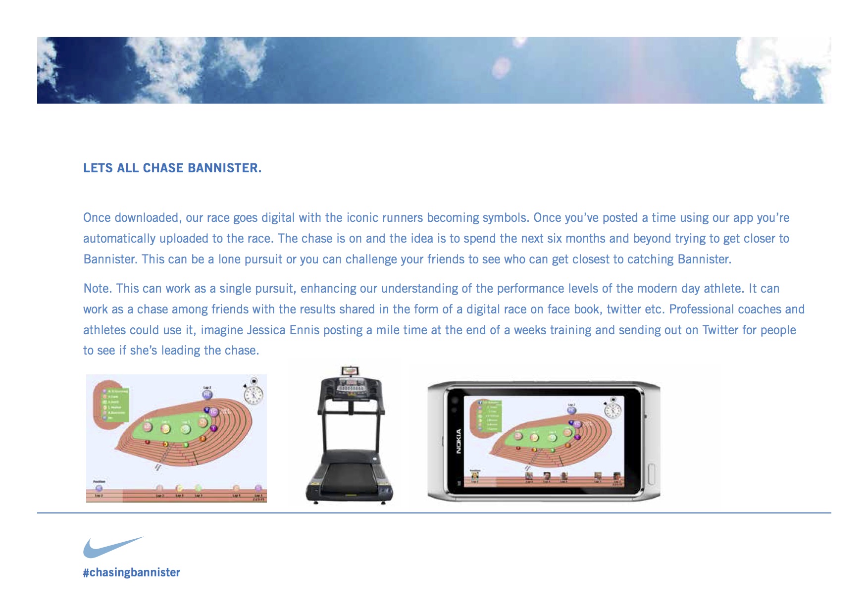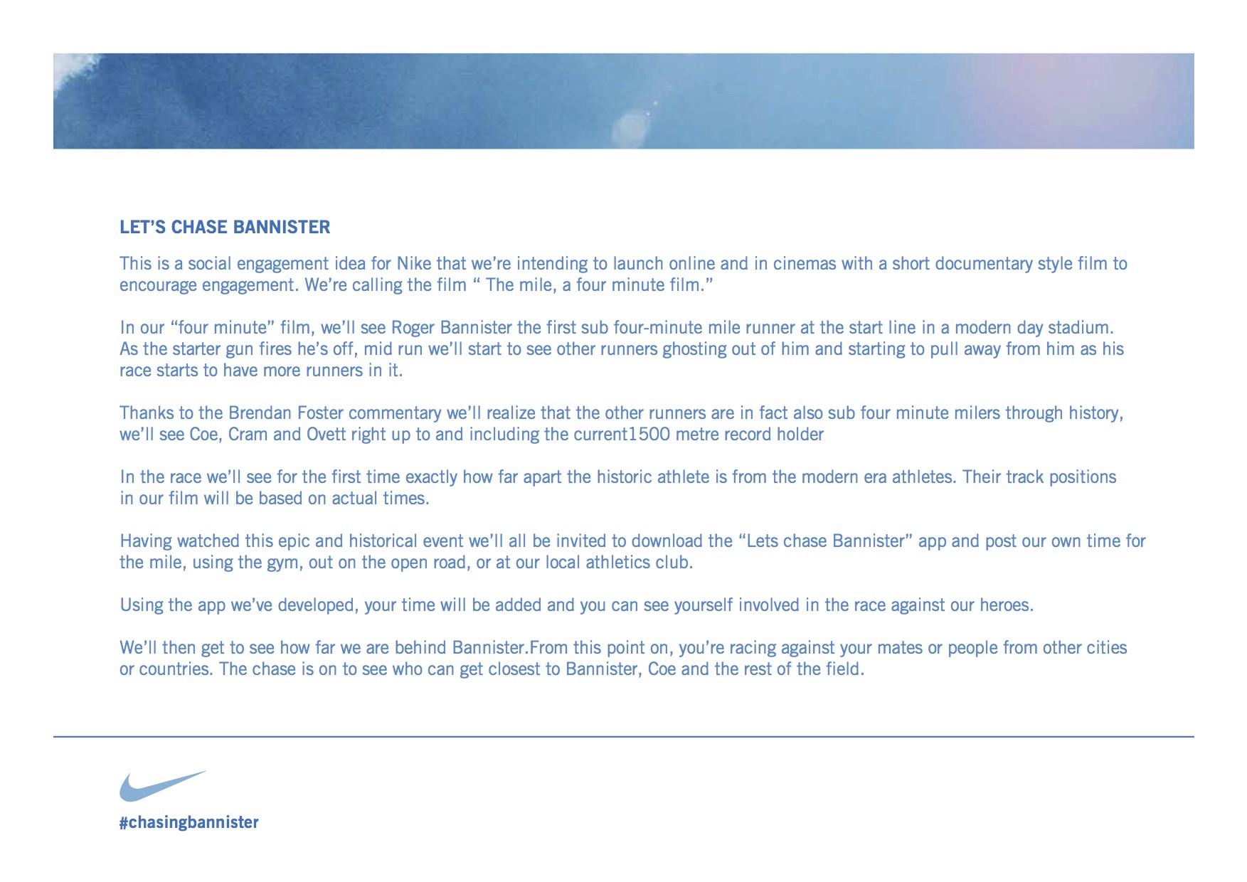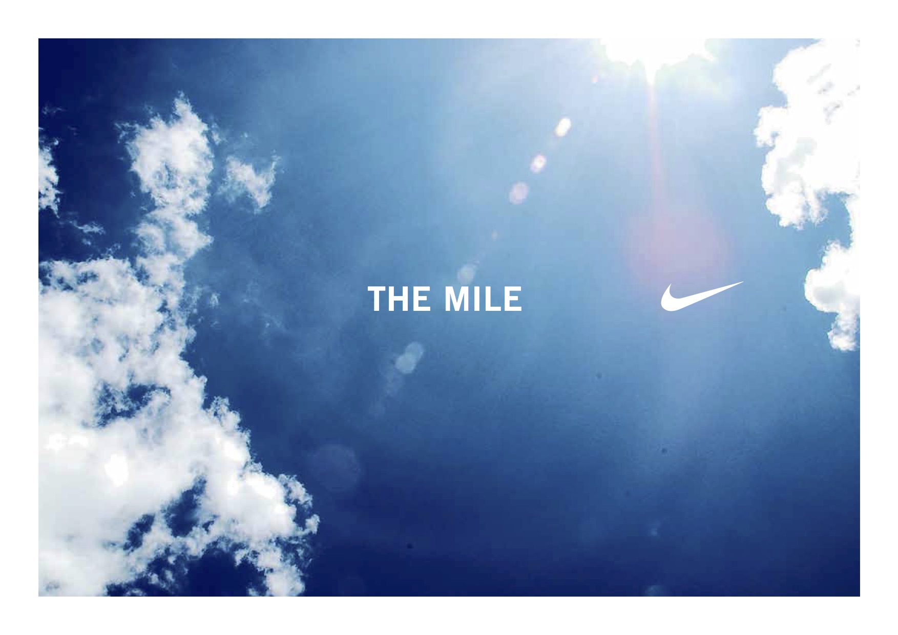 This is a social engagement idea for Nike that we’re intending to launch online and in cinemas with a short documentary style film to encourage engagement. We’re calling the film “ The mile, a four minute film.”